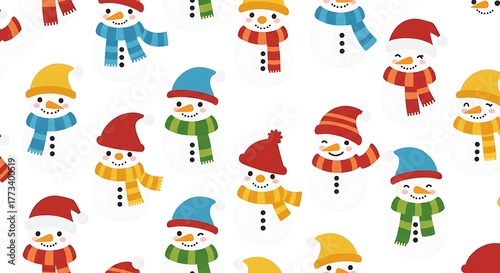 Obraz premium Festive Snowman Pattern with Colorful Scarves and Hats on White Background
