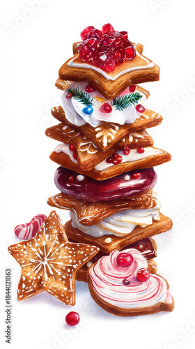 © No background, Obraz premium Festive stack of starshaped gingerbread cookies adorned with icing, cranberries, and sprinkles, isolated on white background