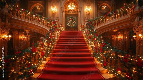 © Євген Луганський, Obraz premium Festive staircase decorated with lights and garlands in an elegant interior