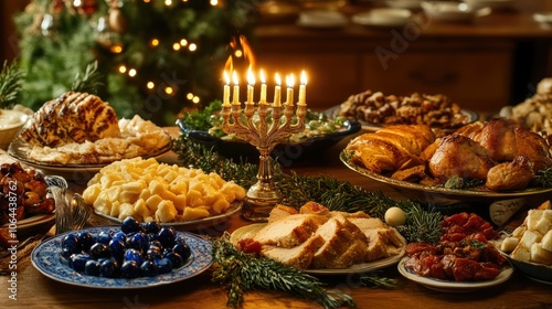 Naklejka premium Festive Table Setting with Holiday Foods and Decorations