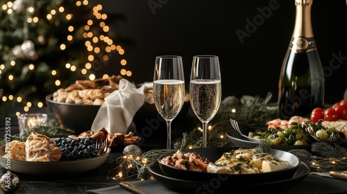 © Srisa, Fototapeta premium Festive table setup with champagne glasses and appetizers for a celebration