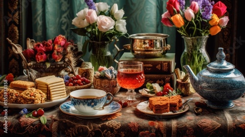 © Ameer, Fototapeta premium Festive Table with Candied Fruits, Wine, and Dates , Moody Still Life Composition