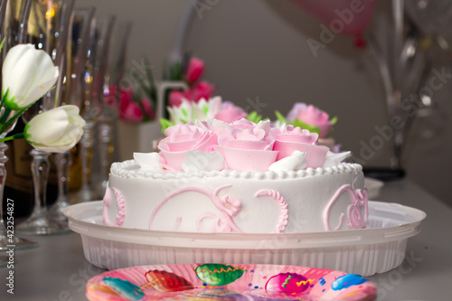 © PAVEL GERASIMENKO, Fototapeta premium festive table with champagne and cake
