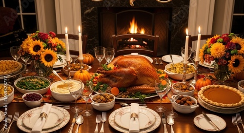 Naklejka premium Festive Thanksgiving Dinner Table Setting with Roasted Turkey and Traditional Side Dishes by Fireplace