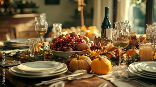 Naklejka premium Festive thanksgiving dinner table with seasonal decorations, autumn harvest feast setting