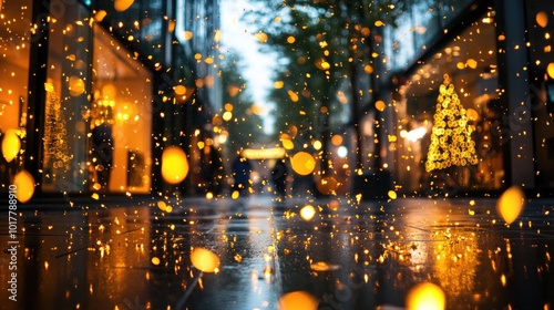 Obraz premium Festive urban winter scene with twinkling christmas lights and tree for...