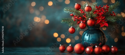 Fototapeta premium Festive vase arrangement featuring thuja branches, ornaments, and red poinsettias against a blurred bokeh background for holiday decor.