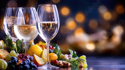 © Giman, Naklejka premium Festive white wine glasses with fruit