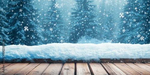 © saeedy, Obraz premium Festive winter scene with snow-covered wooden table and falling snowflakes against a blue background, perfect for seasonal and holiday themes.