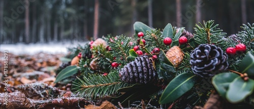 Fototapeta premium Festive Winter Wreath Pine Cones Berries Evergreen
