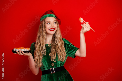 Fototapeta premium Festive young elf in green outfit holding sushi with stylish smile against...