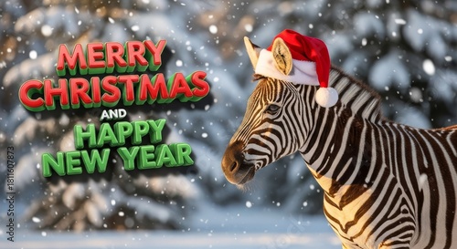 Obraz premium Festive Zebra Christmas Celebration - A zebra wearing a Santa hat stands in a snowy scene wishing Merry Christmas and Happy New Year
