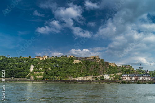 Fototapeta premium Festung Ehrenbreitstein in Koblenz thront über dem Rhein