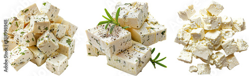 Fototapeta premium Feta cheese bundle, cut in cubes, isolated on a white background, closeup front view and top down view