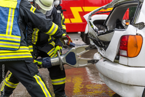 Fototapeta premium Feuerwehr im Einsatz mit Rettungsspreizer