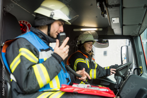 © benjaminnolte, Obraz premium Feuerwehrfrau und Feuerwehrmann sitzen in einem Löschfahrzeug
