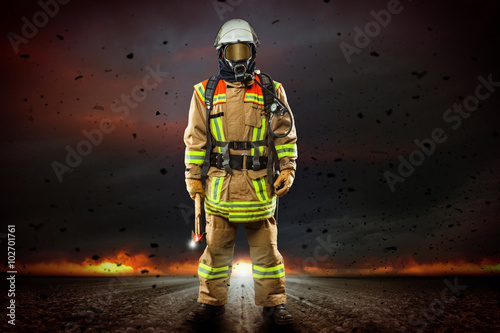 Naklejka premium Feuerwehrmann vor brennendem Horizont
