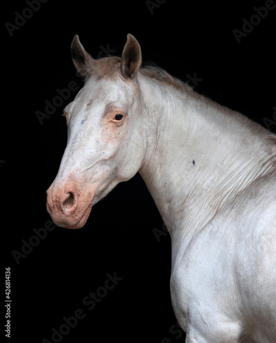 © aurency, Fototapeta premium Few spot leopard knabstrup mare's portrait isolated on black background.