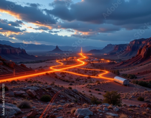 © Thi, Fototapeta premium fiber optic cables crossing rugged desert landscape to connect isolated villages, glowing light pulses transmitting internet data, photorealistic arid environment.