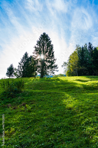 © Stephan Knippel, Fototapeta premium Fichte auf Berg mit dahinter stehender Sonne