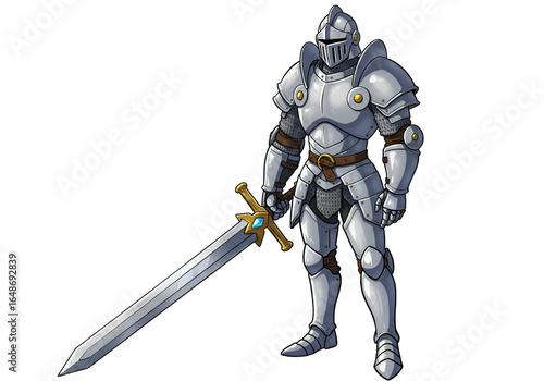 Fototapeta premium Fictional medieval knight in shiny armor wielding a sword, standing...