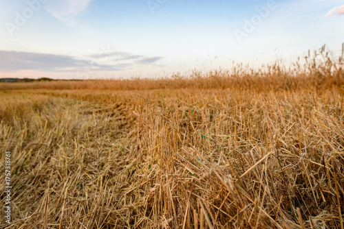 © Natallia, Fototapeta premium Field after barley harvesting at sunset.