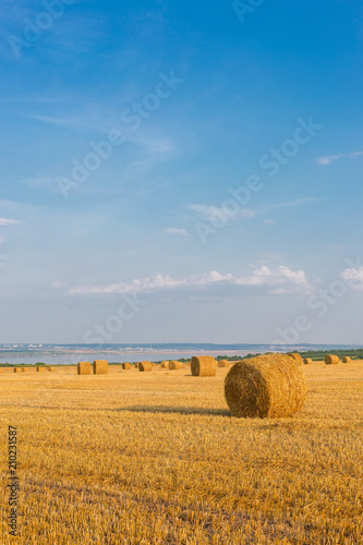 © Mountains Hunter, Fototapeta premium Field after harvest, Big round bales of straw