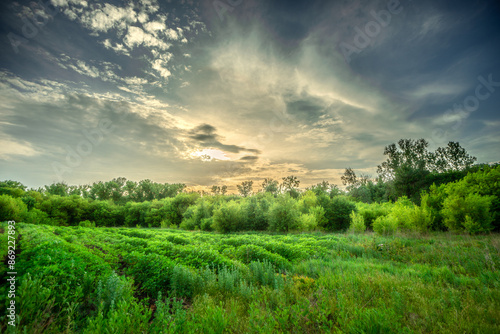 © Aleksandr Riabinin, Obraz premium Field and forest , green trees and leafs . Clouds and sky . Nature at sunner time . Beautiful clouds
