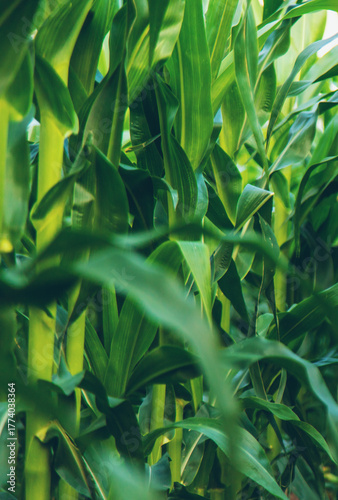 © yanadjan, Fototapeta premium Field corn grows in the field. Selective focus.
