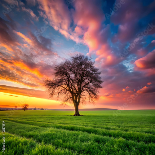 Obraz premium field covered in greenery with a bare tree under a shadow