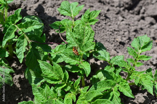 Fototapeta premium Field, farm. Potatoes. Solanum tuberosum. Colorado beetles, Leptinotarsa...
