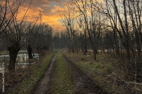 © Roman Bjuty, Obraz premium Field footpath between trees through the forest. On the left side is a willow floodplain grove. In the background is a pond. Dramatic sky between trees at sunset.