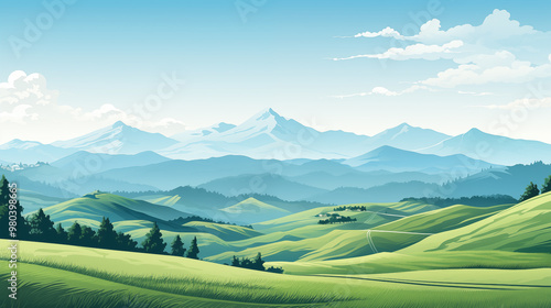Fototapeta premium Field landscape. Minimalist landscape with green hills and blue sky.