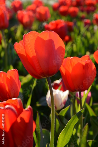 © Olena, Fototapeta premium Field of beautiful red tulips in spring