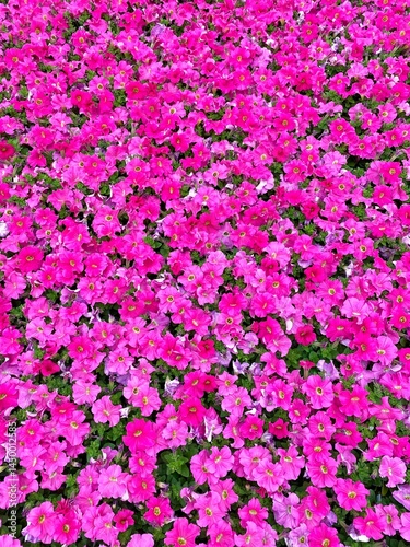 Naklejka premium Field of blooming pink petunias in production nursery ready for garden sales