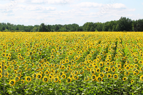 Fototapeta premium field of blooming sunflower on a background of forest and cloudy sky