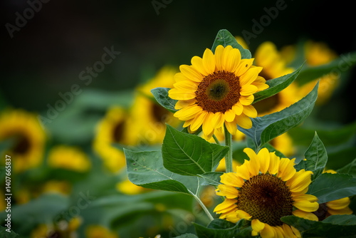 Fototapeta premium Field of blooming sunflowers with vibrant yellow petals and lush green leaves, capturing the essence of summer and natural beauty.