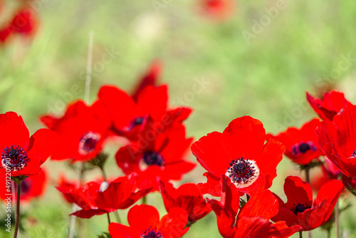 Obraz premium Field of blooming wild flowers of red anemones closeup. selective focus