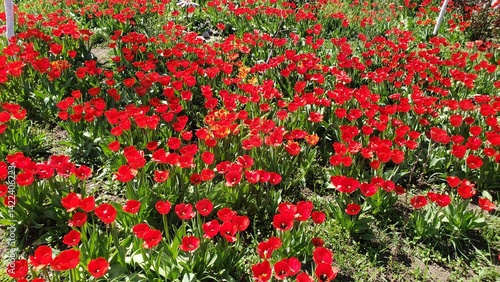 Fototapeta premium Field of Bright Red Tulips in Full Bloom on a Sunny Spring Day