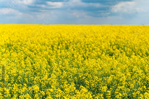 Obraz premium Field of bright yellow rapeseed in spring