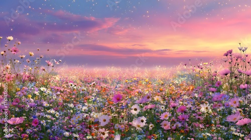© irawan, Fototapeta premium Field of colorful flowers under a pastel sky with gentle light.