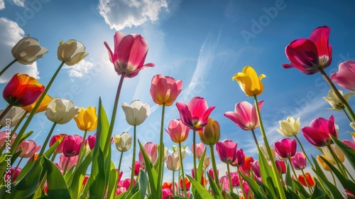 Fototapeta premium Field of colorful tulips reaching to the sky