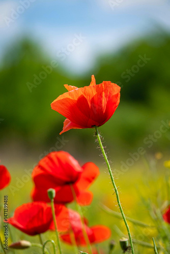 © anderm, Fototapeta premium Field of Corn Poppy Flowers Papaver rhoeas in Spring