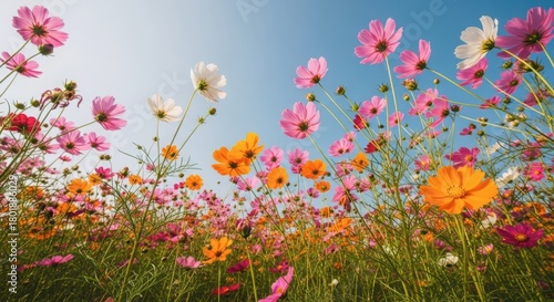 Obraz premium Field of cosmos flowers under a bright blue sky on a sunny day