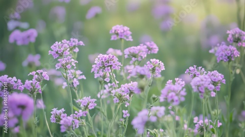 Fototapeta premium Field Of Delicate Purple Wildflowers Under Soft Sunlight In A Serene Spring...