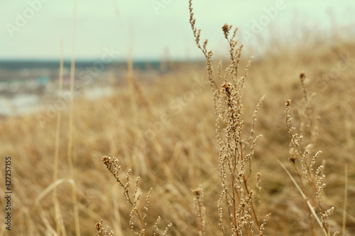 Fototapeta premium field of dry grass close up, gloomy landscape of dry meadow