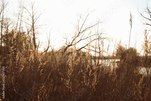 © perminoffa, Obraz premium Field of dry wild spikes backlit with warm setting sun