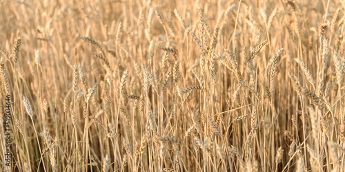 Fototapeta premium Field of golden ripe wheat at sunset. Background