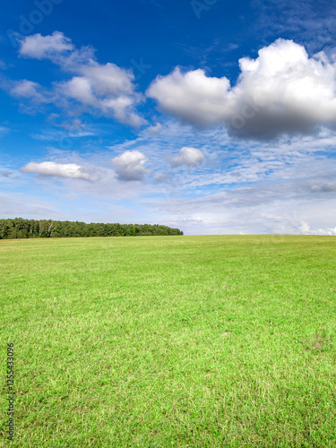 © Sergei, Fototapeta premium Field of grass with a blue sky in the background