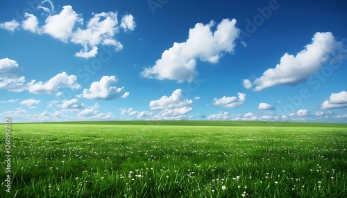 Obraz premium field of green grass and perfect blue sky with white clouds
